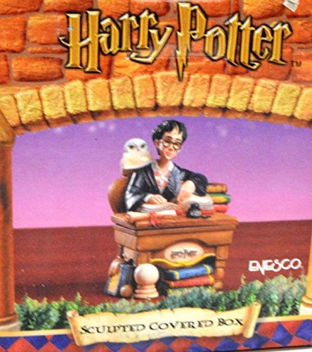 - Harry Potter sculpted covered box showing Harry and Hedwig with spell books at a Hogwarts desk.