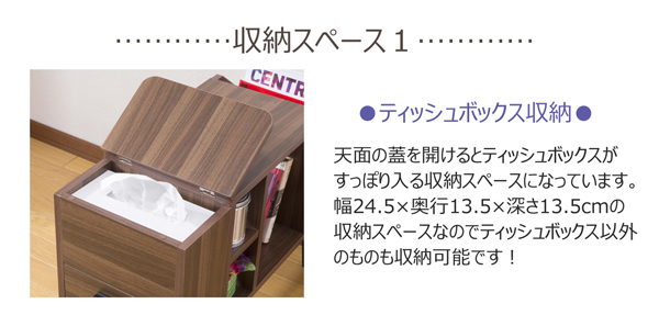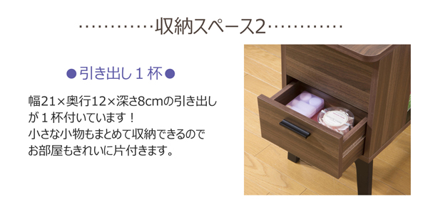 本商品はお取り寄せ商品のため、稀にご注文入れ違い等により欠品・遅延となる場合がございます。誠に恐れ入りますが、何卒ご了承ください。 また、以下の場合には追加送料がかかる場合がございます。  ・同梱区分が異なる商品の複数購入時  【出荷目安】:1 - 4営業日 ※土日・祝除く 【同梱区分】:TS 2232 【梱包サイズ】:通常商品 【代引き決済】:不可  配送伝票の依頼主は出荷元(メーカーもしくは仕入元)名となる場合がございますので、お受け取りの際はご注意ください。   引き出しには小さな小物をスッキリ収納できます。 マガジンラックには本や雑誌が収納出来ます。 ティッシュボックスがそのまま入る収納スペースも付いています。 脚部のみの取り付けなので組立ても簡単です。  【商品名】サイドテーブルチェスト  【サイズ】 幅28×奥行70×高さ47.5cm 引出内寸:幅21×奥行12×深さ8cm ティッシュボックス収納部:幅24.5×奥行13.5×深さ13.5cm オープン部スペース: (小)幅28×奥行11.5×高さ28.5cm (大)幅28×奥行23×高さ28.5cm マガジンラック内寸:幅24.5×奥行10.5×高さ30cm  【重量】10kg  【材質】 本体:プリント紙化粧パーティクルボード(メラミンコーティング) 脚部:天然木(高さ16cm)  【付属品】説明書  【生産国】台湾  ■脚部のみお客様取り付けです。  【ご注意事項】 ・本商品は、北海道・沖縄・離島への配送はいたしかねます。あらかじめご了承ください。
