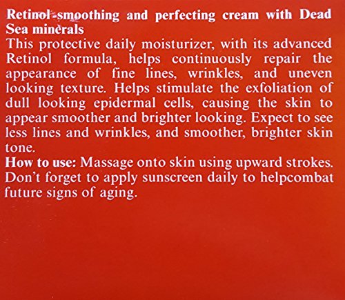 -. Feature : Retinol Smoothing And Perfecting Cream / With Dead Sea Minerals / Size - 1.69 oz / 50ml / Daily Moisturizer with an advanced Retinol formula helps continuously repair the appearance of fine lines wrinkles and uneven texture. / Helps Stimulate the exfolation of dull looking epidermal cells causing the skin to appear smoother and brighter looking . Expect to see less lines and wrinkles and smoother brighter skin tone!