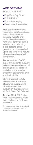 Studio : Aroma Naturals Publisher : Aroma Naturals Binding : Health and Beauty Product Description Fruit stem cell complex, resveratrol CoQ10, and aloe vera polysaccharides instantly hydrate and replenish with essential nutrients, gently soothing irritation and balancing skin’s delicate pH as geranium and orange leaf uplift and tone for a natural glow and a rejuvenated complexion. 0
