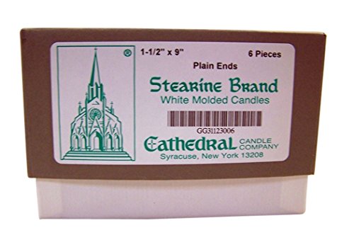 Cathedral Brand White Molded Stearine Candles with Plain Ends, 1 1/2 Inch x 9 Inch, Box of 6