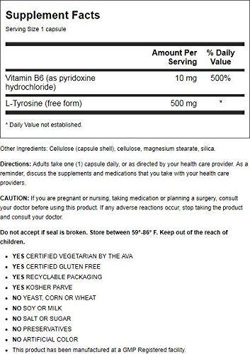 Country Life L-Tyrosine Vegetarian Capsules is a free form amino acid supplement with B-6. It aids in the utilization of Tyrosine.
