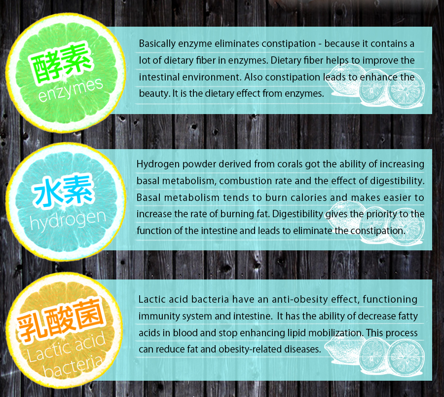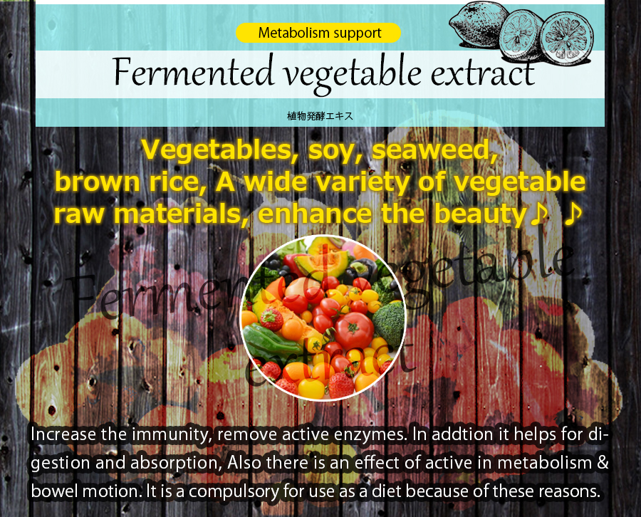 | Ingredients | Glucose, indigestible dextrin, fruit juice powder (lemon juice concentrate powder, dextrin, starch), honey powder, candle bush end, Coleus false coli extract powder, Kidachiaroe end, dextrin, fossil coral hydrogen powder, lactic acid bacteria (sterilization) (milk ingredient the including), wild grass fermentation extract powder containing the (apple-yam), plant fermentation end (dextrin, fruit and vegetables, cereals, wild grass extract, sugar, seaweed) (soybean, orange, kiwi fruit, bananas, cashew nuts, including sesame), fermented plant extract powder, including the grain fermentation extract (wheat), maltodextrin / citric acid, flavors, sweeteners (aspartame · L- phenylalanine compound), coloring (safflower yellow), vitamin C, vitamin E , niacin, pantothenic acid Ca, vitamin B2, vitamin B1, vitamin B6, vitamin A, folic acid, vitamin D, vitamin B12 |