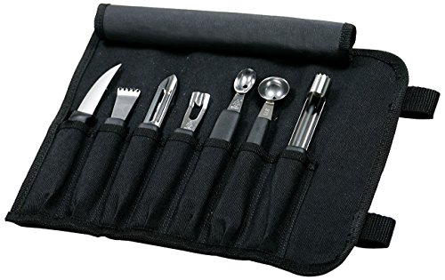 - Includes a 7 inch peeling knife, 5.5 inch citrus zester, 6.5 inch vegetable peeler, 5.5 inch channel knife, 6.125 inch oval melon baller, 6.375 inch double melon baller, 7 inch apple corer, and a heavy duty roll to store it all in