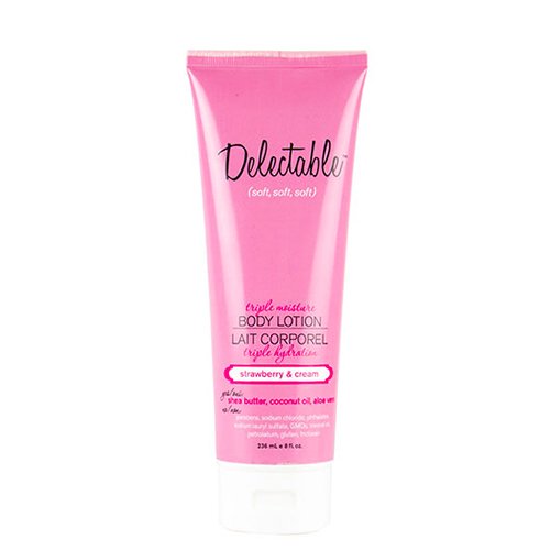 -. Binding : Health and Beauty -. Brand : Delectable by Cake Beauty -. Color : white -. Department : Female -. EAN : 0823168000015 -. Feature : Indulge in three times the softness, three times the smoothness and three times the richness. / Enriched with coconut oil, shea butter, and aloe vera. / Glides on smoothly and absorbs quickly. / Cruelty-free. Vegan. Natural ingredient-driven. / Gluten-free. GMO-free. Paraben-free. Phthalate-free. -. Label : Delectable by Cake Beauty -. Manufacturer : Delectable by Cake Beauty -. Model : C240T -. MPN : C240T -. PackageQuantity : 1 -. PartNumber : C240T -. ProductGroup : Beauty -. ProductTypeName : BEAUTY -. Publisher : Delectable by Cake Beauty -. Size : 8 OZ -. Studio : Delectable by Cake Beauty -. Title : Delectable by Cake Beauty Triple Moisture Body Lotion, Strawberry/Cream -. UPC : 823168000015