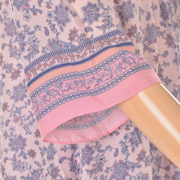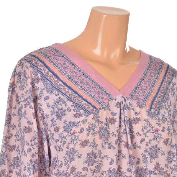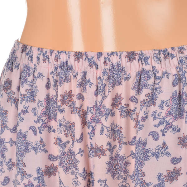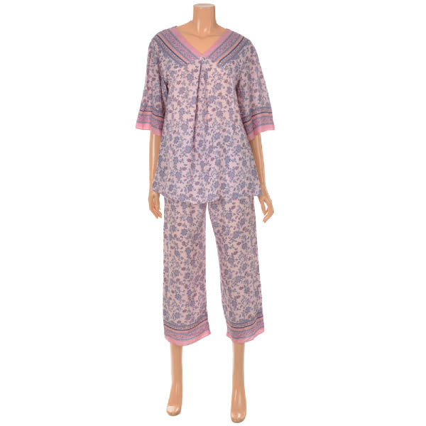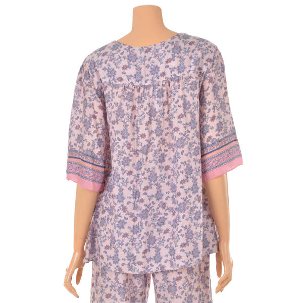 터치감이 좋고 시원한 촉감의 레이온 소재에피치 핑크 컬러 페이즐리 패턴으로여성스러운 홈웨어 상,하의 세트입니다보더로 목 'V'와 소매, 바지 밑단에 포인트를 준 디자인으로레이온 소재로 추동 초반까지 입을수있는 제품입니다.가벼운 소재로 여름철 시원하게 착용 가능하고,연령대 구분없이 감각적인 실내복을 찾는 분들에게 추천드리는 제품입니다.
