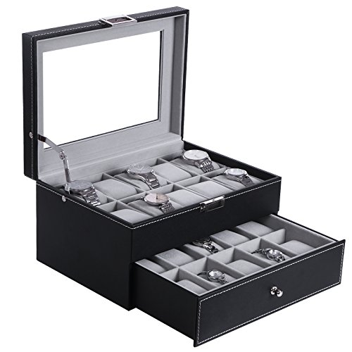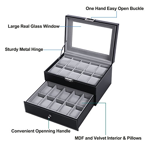 TOP-NOTCH QUALITY & FANTASTIC LOOK: Made from good quality black PU leather cover, well-done seams, refined interior, smooth actual hinge, see-through real glass top, this well-built watch box is sturdy as well as elegant. Your beloved must be very happy when receiving such a nice gift at birthday or Christmas