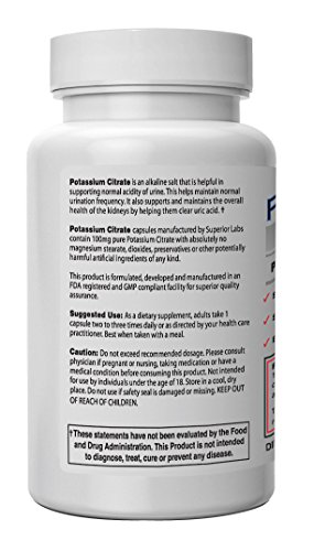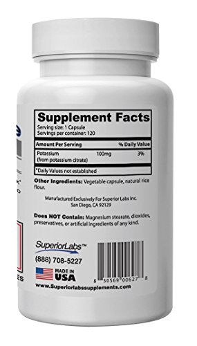 -. Binding : Health and Beauty -. Brand : Superior Labs -. EAN : 0850569006278 -. Feature : HIGHEST PURITY: Our products contain zero magnesium stearate, synthetic ingredients, dioxides, anti-caking agents, preservatives, colors or flavors. There are zero unnatural potentially harmful or artifical ingredients of any kind. / SAFE: Made in USA. Formulated, developed and manufactured in USA in FDA registered and GMP compliant faciliites / BEST VALUE: Long lasting high dosage 99mg, 120 Vegetable Capsules / 100% NO QUESTIONS MONEY BACK GUARANTEE: If you are unsatisfied for any reason at all we stand by our Iron Clad 60 day no questions money back guarantee. Just contact us through Amazon for a full and prompt refund within 24 hours or less. -. IsAdultProduct : 0 -. Label : Superior Labs -. Manufacturer : Superior Labs -. PackageQuantity : 1 -. ProductGroup : Health and Beauty -. ProductTypeName : HEALTH_PERSONAL_CARE -. Publisher : Superior Labs -. Studio : Superior Labs -. Title : #1 Quality Potassium Citrate by Superior Labs - 99mg, 120 Vegetable Caps - Made In USA, 100% Money Back Guarantee -. UPC : 850569006278