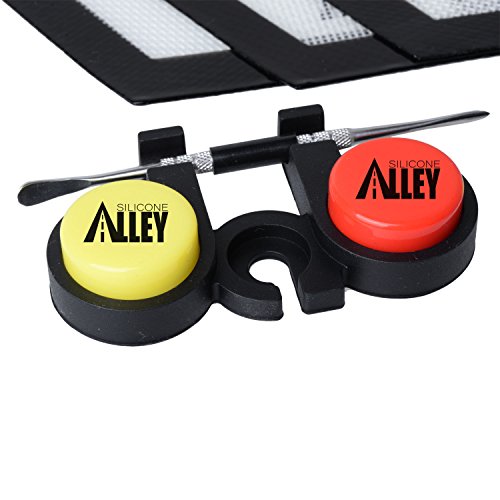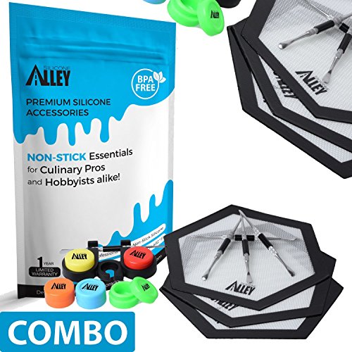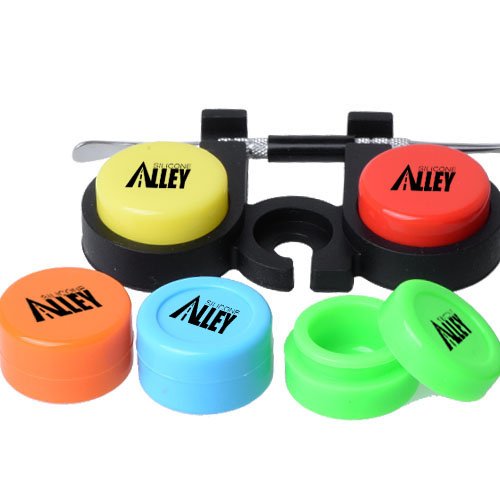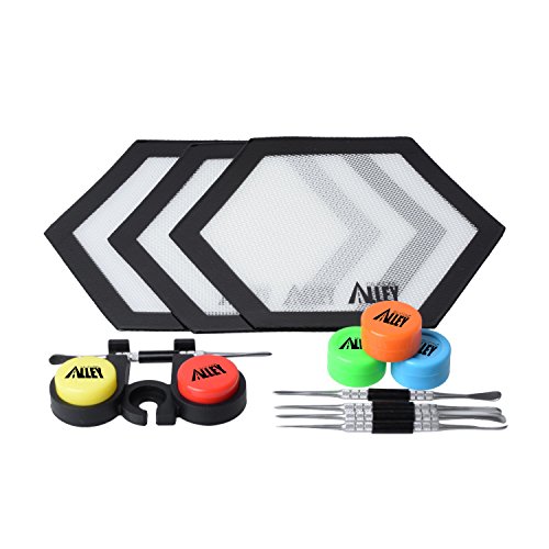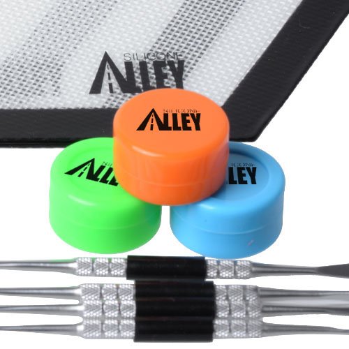Includes: 3 small hexagon black silicone mats with Silicone Alley logo + 5 silicone wax containers of five bright solid colors + 3 nice and shiny silver stainless steel carving tools with removable covers in the middle + 1 black dual silicone container holder