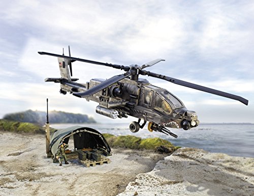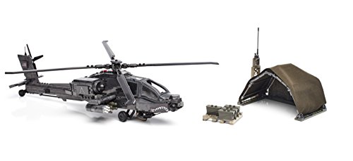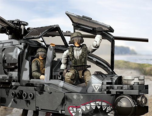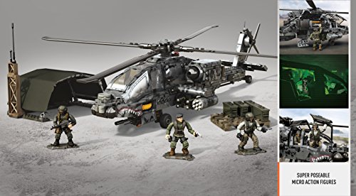 Build the Call of Duty Anti-Armor Helicopter collector construction set by Mega Bloks. Powerful and agile, attack helicopters provide close air support for grounded infantry. With a sleek black finish and printed nose detail, this buildable chopper comes ready for action with rotating propellers and a working missile launcher. Open the hatch to sit your pilots in a cockpit with glow-in-the dark controls, access the engine through the side hatch, or open the storage bay and load in your ammunition. Build a Fuel Arming and Refueling Point for your officer on the ground when you set up the real fabric tent, tank, and crate. Then, prepare to take to the skies when you use the detachable armor and authentic accessories to suit up your three highly detailed, super-poseable micro action figures.