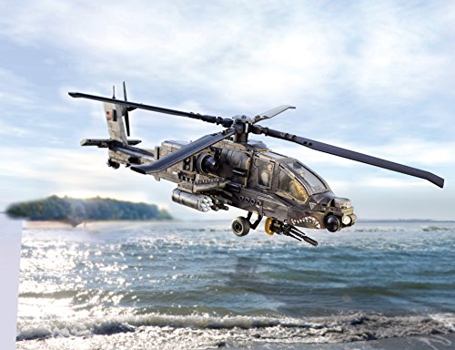 Buildable Anti-Armor Helicopter with printed nose detail, rotating propellers, working missile launcher, ammo compartment, opening engine hatch and cockpit with glow-in-the-dark controls