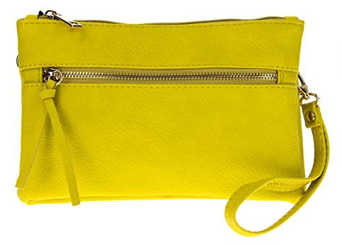 -. Feature : DESIGN: casual utlity wristlet bag; zipper top closure at 2 main compartment, 1 slip pocket in middle: 1 inner zipper pocket, 2 inner side pouches. / MATERIAL: manmade synthetic PVC leather, solid-colored fabric lining, gold-tone hardware. / ACCESSORIES: this wristlet comes with 1 removable 8.5"drop wrist strap, 1 removable 25" drop crossbody strap. / DIMENSIONS: exterior 9"Length X 6"Height X 2.5"Width / ORIGIN: Made in China