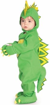 -. Feature : Romper & headpiece / Has inner leg snap closures for easy diaper changing / Attached shoe covers/booties with nonskid soles / Separate dragon headpiece with dragon fins on back of head and tail / Made of a soft comfortable fleece fabric