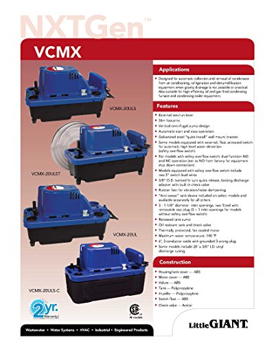 Little Giant VCMX-20UL1/30 HP Automatic Condensate Removal Pump, 6' Power Cord (554520)
