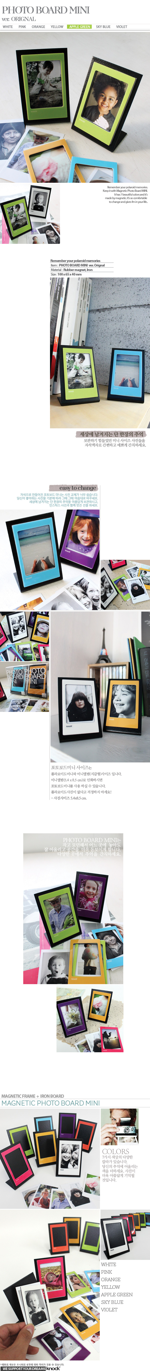 폴라로이드미니용 액자입니다. 프레임 뒷면에 고무자석을 적용하여 쉽게 금속보드에 붙이거나 띨 수 있어 사진교체가 아주 간편하다는 것이 특징입니다. 또 한 추가로 다양한 색상의 프레임 구입이 가능하여 사진에 분위기에 따라서 바꾸어 보실 수 있습니다.