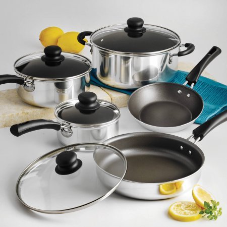 -. Feature : Complete cookware set with nonstick interior for easy cooking and cleaning / Heat- and shatter-resistant tempered glass lids allow easy monitoring of cooking progress / Riveted, stay-cool handles / Dishwasher-safe / Compatible with gas, electric and ceramic glass cooktops / Set includes: 7" saute pan, 9" deep saute pan with lid, 1 qt sauce pan with lid, 2 qt sauce pan with lid, 4 qt Dutch oven with lid