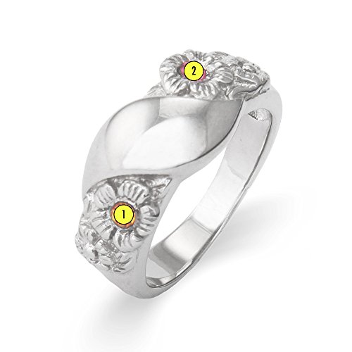This Silver-Tone ring features two small flowers with your choice of two round cut cubic zirconia simulated stones to be placed on each flower. There is a smooth surface in the center of to ring to add an initial. The inside of the room can also be engraved with the year of graduation.
