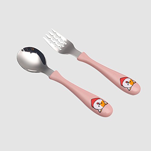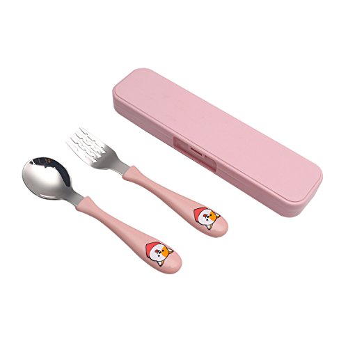 Kids Portable Stainless Steel Cute Utensil Set, 2-pieces Flatware includes Spoon and Fork with Box (Pink)