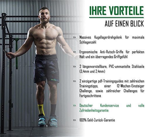 -. Feature : ✅ #1 TOP SP.R.INGSEIL MIT 2 VERSTELLBAREN STAHLSEILEN, KUGELLAGER-DREHGELENK, UND ERGONOMISCHEN ANTI-RUTSCH GRIFFEN - Verbessern Sie Ihre Kraft, Ausdauer, Agilität und Koordination mit dem wohl besten Speed Rope am Markt. Hochwertig, langlebig, sicher für ein Höchstmaß an Freude und Sicherheit beim Training. / ✅ GEEIGNET FÜR JEDERMANN - ÜBERZEUGEN SIE SICH SELBST - Ob Mann oder Frau, Profisportler oder Anfänger: Die beiden robusten 300cm langen Stahlseile - eines dicker, eines dünner - lassen sich individuell auf jede Körpergröße anpassen und kinderleicht austauschen. Durch die ergonomisch geformten Anti-Rutsch Griffe liegt das Speed Rope selbst bei intensiven Einheiten sicher in der Hand. / ✅ DIE BESTE WAHL FÜR UNZÄHLIGE FITNESSÜBUNGEN - Ob intensive WODs, Boxtraining, MMA, Double Down Unders und Workouts zu Hause, im Studio oder im Freien - das einzigartige 90°-senkrechte Drehgelenk mit Kugellager sorgt für ultraleichtes Rotieren und ermöglicht eine viel höhere Schlaganzahl als herkömmliche SP.R.Ingschnüre. / ✅ GRATIS TRAININGSGUIDE FÜR DAS PERFEKTE WORKOUT PER EMAIL - Das mitgelieferte BeMaxx Fitness Trainingsguide E-Book inkl. 12-Wochen Einsteiger-Workoutplan und herausfordernden Challenges unterstützt Sie dabei, das Maximum aus Ihrem Training herauszuholen. / ✅ 100% GELD-ZURÜCK-GARANTIE UND DEUTSCHER SERVICE - Überzeugen Sie sich selbst und bestellen Sie Ihr BeMaxx Fitness Jump Rope noch heute völlig ohne Risiko. Sollten Sie nicht zu 100% zufrieden sein, bieten wir Ihnen eine stressfreie Geld-Zurück-Garantie für 365 Tage.