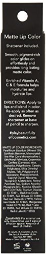 This convenient jumbo sized lip pencil creates exact color application with twist up ease so you never have to sharpen. The pigment rich color glides on effortlessly and easily to provide long lasting matte color. The enriched Vitamin A, C E formula moisturizes and hydrates lips for beautiful healthy looking lips. DIRECTIONS Apply to lips and blend in color. Re apply as often as desired. Use alone or layer with your favorite lip gloss shade for a glossy effect. INDREDIENTS Dimethicone, Polysynlane, Mineral Oil, Euphorbia Cerifera Candelilla Wax, Polyethylene, Cerifera CarnaubaWax. Silica, Mica, Methylparaben, Tocopherol Acetate VE, Retinyl Palmitate VA, Magnesium Ascorbyl Phosphate VC, Titanium Dioxide CI 77891, Iron Oxides CI 77491 CI 77492 CI 77499, Blue 1 LakeCI 42090, Red No.6 Lake CI 15850, Red No.27 Lake CI 45410 Net Wt. 0.05 oz 1.4 g
