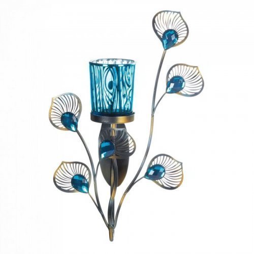 Studio : Tom Co. Publisher : Tom Co. Binding : Kitchen Product Description Your room will sparkle with gorgeous candlelight when you light a candle inside this stunning wall sconce. The peacock inspired design of the turquoise candle cup and the metallic plumes with faceted turquoise jewels will delight you day and night. 0