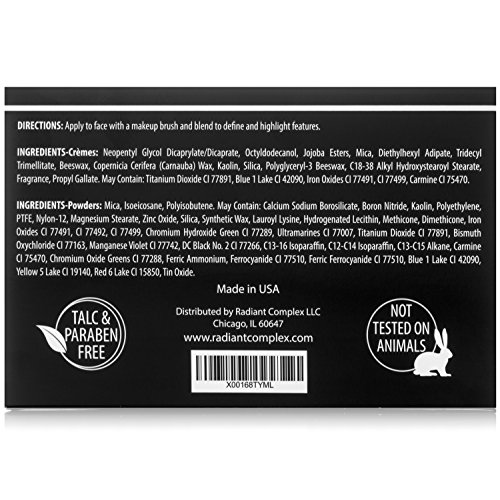 If you truly want to master makeup contouring, the quality of your makeup matters! Treat yourself to the ultimate professional makeup contouring kit Unlike others, this palette features 4 cream colors AND 4 powder colors, so you don't have to choose between a cream or powder palette. Get both, all in one great palette! Start with the creams and finish your look with the powders...mix and match to achieve the perfect look for your skin! Radiant Complex Ultimate Contour Kit provides the best value based on cost per ounce and the amount of product you will receive. Radiant Complex products are made in the USA, not tested on animals and paraben free. Add to your cart with confidence and you're on your way to perfectly contoured makeup looks.Feature