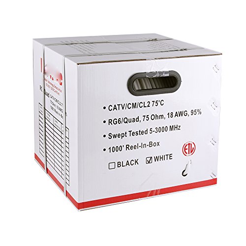 UL Listed RG6 18AWG Coaxial Cable, Quad Shielded, White, Spool, 1000 foot