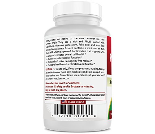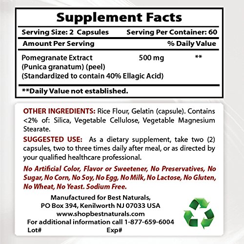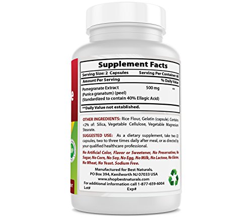 Best Naturals Pomegranate 250 mg features pomegranate fruit extract standardized to 40% ellagic acid. Preliminary laboratory studies have shown that ellagic acid is a powerful antioxidant that supports DNA integrity and promotes overall cell health.Feature