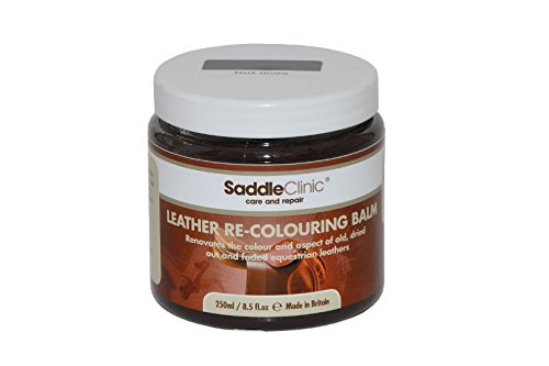 -. Binding : Misc. -. Brand : William Hunter Equestrian -. Feature : Leather Re-Colouring Balm can be used on virtually any absorbant equestrian leather, including saddles, tack and riding gear. / It restores the colour to all faded, scuffed and scratched leathers so long as the damage is a lighter shade than the leather. -. Label : William Hunter Equestrian -. Manufacturer : William Hunter Equestrian -. ProductGroup : Sports -. ProductTypeName : SPORTING_GOODS -. Publisher : William Hunter Equestrian -. Studio : William Hunter Equestrian -. Title : Saddle Clinic Leather Re-Colouring Balm Without Transfer! - 250ml (Choose From Black Or Brown)