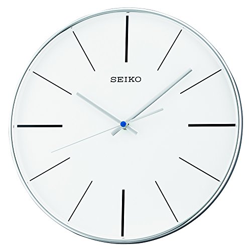 Quartz movement, Silver-tone hands, Quiet sweep second hand, Black markers, White dial, Silver-tone metallic case, One "AA" battery included, Dimensions: 11 1/2" diameter x 2"