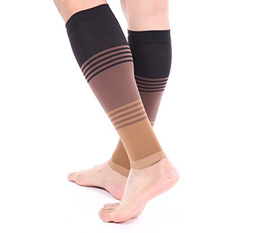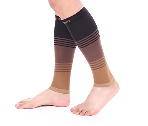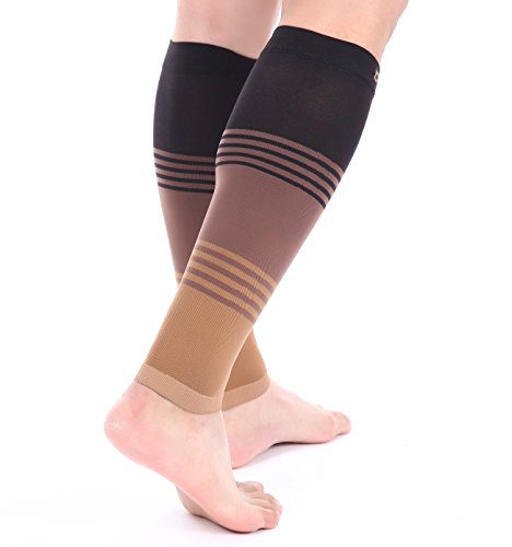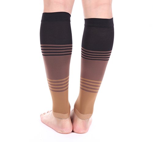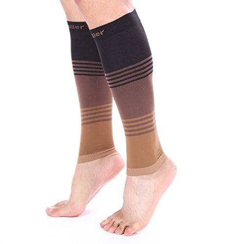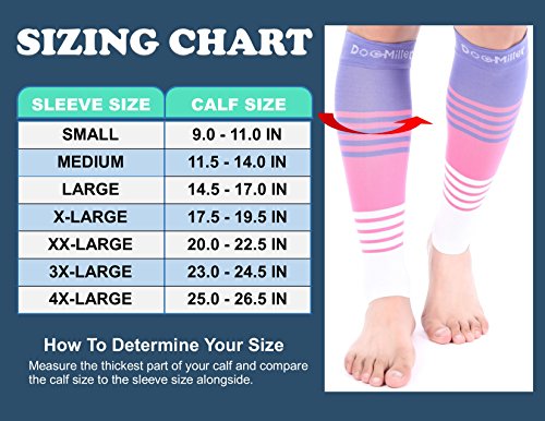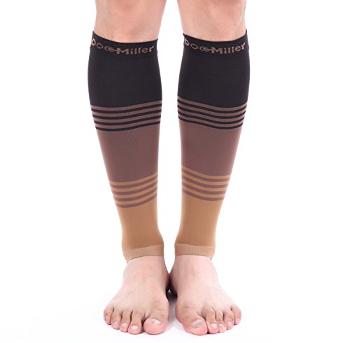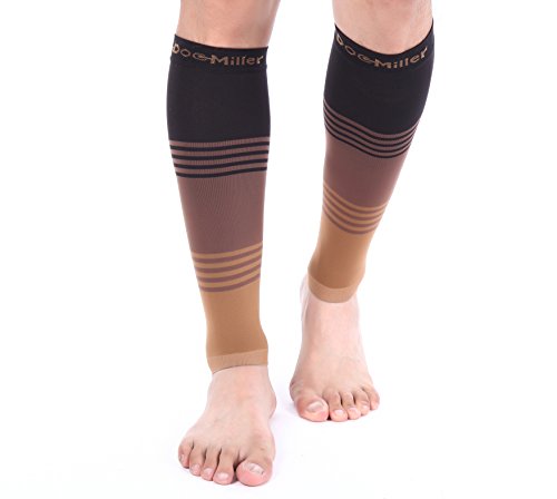 Doc Miller Calf Compression Sleeves are made of Durable, Breathable, Comfortable, Premium fabric made of high-grade Nylon (77%) and Spandex (23%) for a snug, comfortable, compressive fit. The sleeves aid in faster recovery for improved performance and support. By boosting blood circulation in your legs and preventing injuries, the sleeves allows you to feel fresher for more activity. The perfect graduated support ranging from 20-30 mmHg allows for more blood flow where needed. Perfect opaqueness provides a professional look and feel and the compression lasts a long time. The open toe version can be used as pregnancy maternity stockings. What Size Should You Get? The sizing chart displays product sizes for a range of calf sizes including plus sizes. Who Should Use It Effective for both men, women and teens, use them for a wide range of activities - from warming up to sessions of Tennis, Basketball, Racquetball, Football, Soccer, Hiking, Cross Fit, and other athletic activity. Fabric characteristics keep it comfortable regardless of season. If you are pregnant, in nursing as a nurse, in retail or construction this product will prevent soreness and aching feet. If you travel by air, this product may help reduce fatigue and Deep Vein Thrombosis (DVT). This product may help those suffering from lymphedema, neuropathy, sciatica, calf cramps, spider or varicose veins, venous insufficiency, shin splints, calf pain, swelling in the feet, inflammation, pain in leg, soreness and aids in faster recovery from sports activities and running. Studies show compression accelerates recovery after workout by increased blood circulation. This product may also help you with Restless Legs Syndrome (RLS). Don't wait anymore! Experience the benefits yourself. Different sizes sell out - if you see your favorite color/size click Add to Cart. Your calves and legs will thank you! 0 |