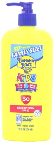 Banana boat kids sunscreen lotion contains titanium dioxide, recommended for children's sensitive skin for broad spectrum UVA and UVB protection from sunburn and skin damage. The gentle formula is long-lasting and very water resistant to keep up with active kids. The convenient pump dispenser makes application fast, easy and less messy for the whole family. 12 FL OZ (354 ml) - SPF 50.Feature