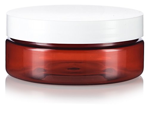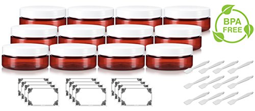 4 oz / 120 ml Amber PET Plastic (BPA Free) Refillable Extra Low Profile Jar with White Lid (12 PACK) + Spatulas and Labels