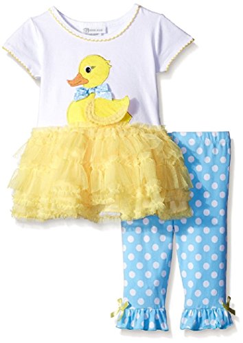 -. Feature : 95% Cotton, 5% Spandex and machine washable / Multi-tiered mesh tutu skirt / Cutie texture duck with 3-D wing applique' / Come with Blue/white dot ruffle hem leggings / Perfect for Easter, SP.R.Ing and Summer wearable, she'll want to wear it every day!