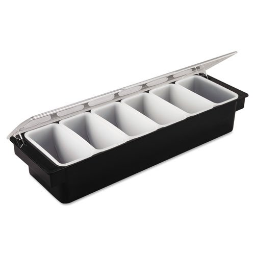 -. Title : Rubbermaid Commercial Condiment Dispenser, 6pt, 19 5/8w x 6 1/4d x 3 3/4h, Black/White/Frost - Includes one dispenser and six inserts.