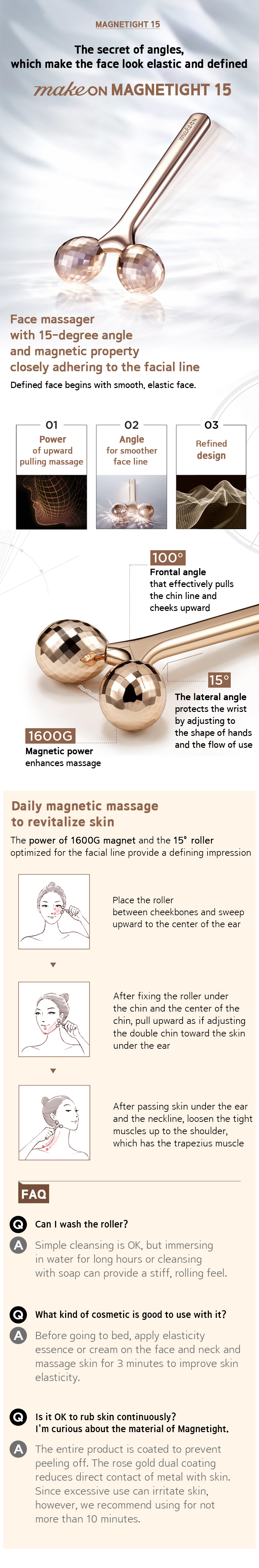 Daily magnetic massage to revitalize skinThe power of 1600G magnet and the 15° roller optimized for the facial line provide a defining impression