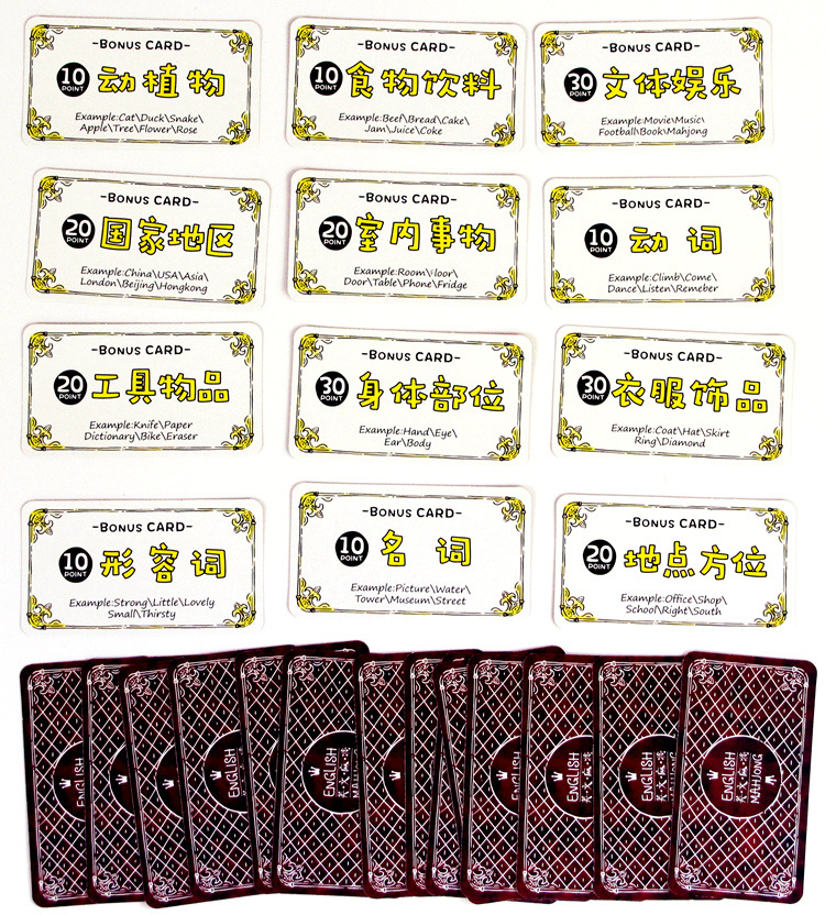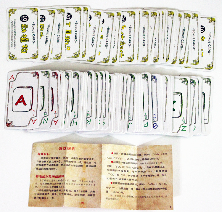 Just play with the classic Chinese rules, the only difference is that the traditional tiles are replaced by cards of english letters. Besides many bonus cards are added to enhance difficulty.