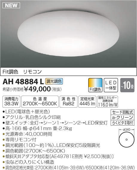 ●調色時定格光束値:2700K時(4105lm・39.6W)/6500K時(4120lm・36.9W)