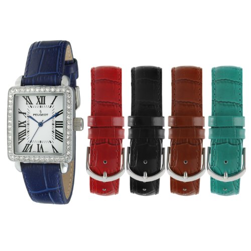 Rectangular watch featuring crystal bezel and Roman numeral markers with five interchangeable leather straps