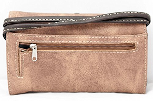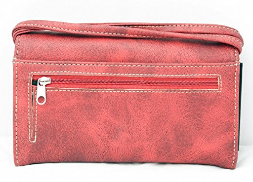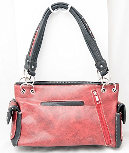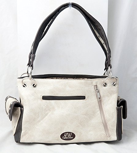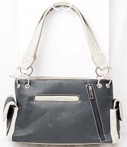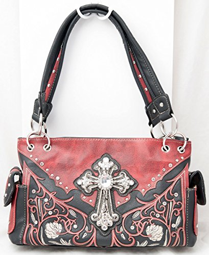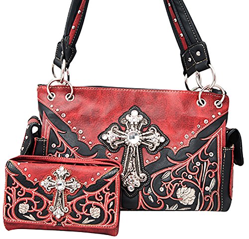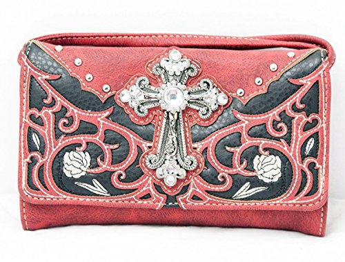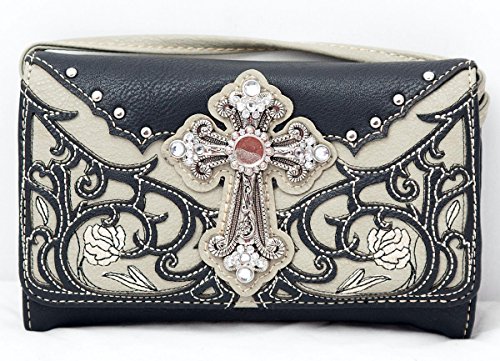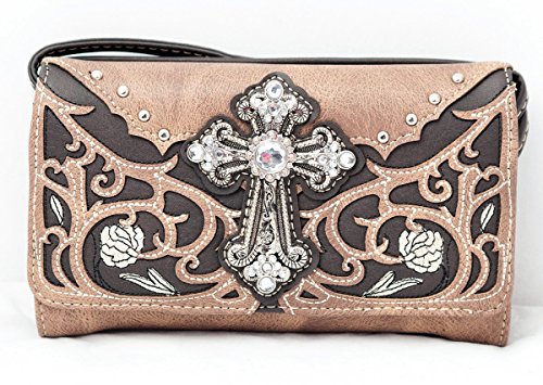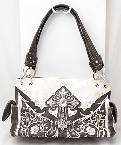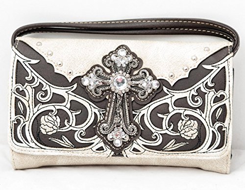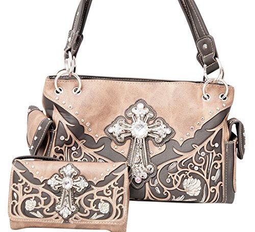 Product Description Western handbag is made from high quality premium faux/imitation leather with decorative leaves/vine embroidery and beige roses/flowers accented with silvertone studs, rhinestones, and a large silvertone rhinestone cross on the front. Secure your possessions with its zip top closure. Spacious and designed to keep you organized with its single compartment fabric lined interior divided with a medium zippered pocket, front wall that has 2 open pouch pockets and a zippered wall pocket on inside rear. One secure zippered pocket on the back for a concealed carry handgun (10" x 7") and one open pocket that can fit 5 inch smartphone. Double flat strap chain handles. Two side pockets with flap that snap closed magnetically that can store your tissues, lipstick or any items you need to access quickly and easily. Metal feet on the bottom to keep the bag clean, protected and stable. Suitable for work, shopping, church, vacations, evenings out with friends or just to stand out and show off your western bling style. 13.5 inches long X 8 inches tall x 4.5 inches wide. Matching wallet/wristlet/clutch has cut-out decorative scroll and beige roses/flowers accented with silvertone studs and a large silvertone rhinestone cross on the front. Single, removable strap to convert the wallet into a wristlet and a single, long removable shoulder/crossbody strap. Snap closure. Flat currency compartments, expanding accordion area for coupons or receipts and a zippered pocket on the inside. 9 slots on the inside for credit cards, ID, or business cards and 3 clear ID windows. Zippered pocket on the back for coins. 7.5 inches long X 1.5 inches wide X 4.5 inches tall. 0