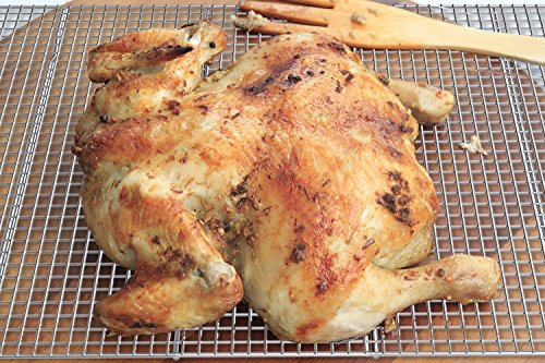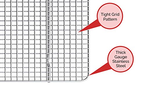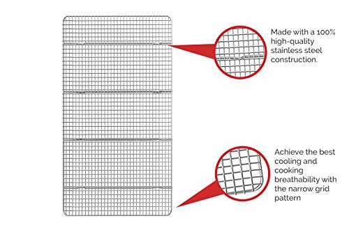 Constructed from 100% premium-grade stainless steel without any dangerous additives, coatings, or treatments to prevent food contamination, rust, and corrosion.Narrow grid pattern allows for a durable, sag-free cooking and cooling experience, whether you're crisping bacon in the oven or cooling peanut butter kiss cookies.Sized perfectly for the appropriate baking pan for use in the oven and easily cleaned in the dishwasher. You'll be using this cooling rack over and over again!The Ideal Choice for Your Culinary Pleasures