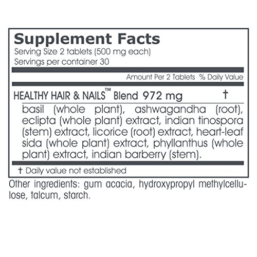 Nutritional support for hair and nails - Like every other aspect of long-lasting beauty, healthy hair and nails have their roots in proper nutrition. Excessively dry or brittle hair, split ends, and a flaky scalp are all signs of a nutritional imbalance. | This formula specifically: •Supports the health of the liver, helping to flush out toxins •Promotes resistance to day-to-day stress which can harm hair health | While a good shampoo and the right genes don't hurt, it's the nutrients you feed your hair that often determine whether it maintains its color, strength and luster over the years. The Healthy Hair & Nails herbal formula supports and balances the metabolic processes that govern hair and nail growth and health. It also promotes resistance to stress, which can be damaging to hair. Includes eclipta and ashwagandha.Feature