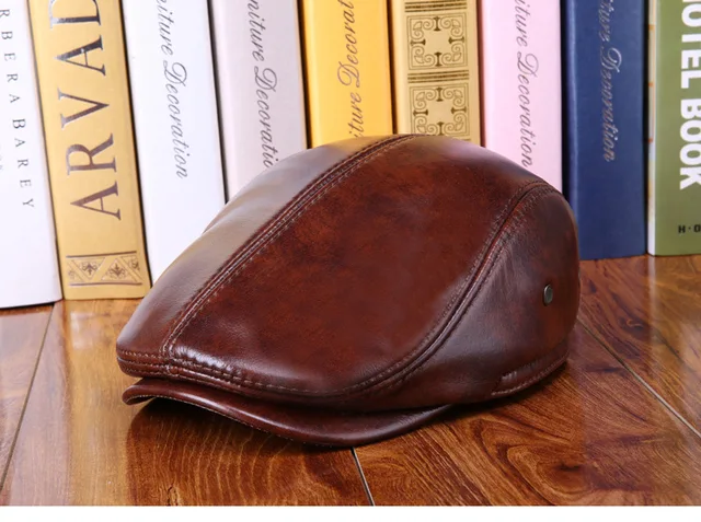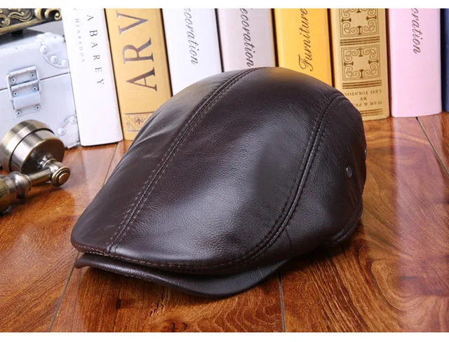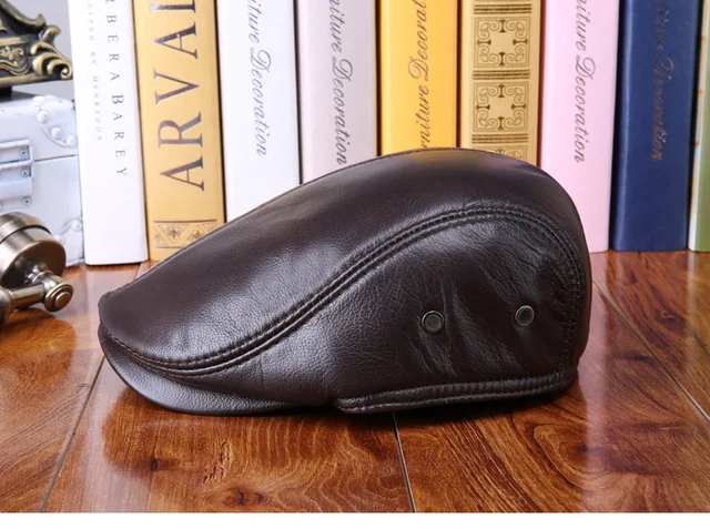 | [해외]높은 품질 진짜 가죽 방풍 남자 베레모 cap 수석 남성 겨울 CowSkin 모자 가을 블랙 브라운 귀 보호 따뜻한 모자 cap |