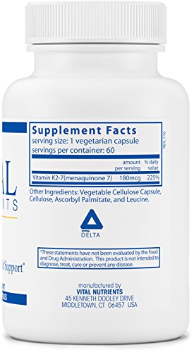 -. Binding : Health and Beauty -. Brand : Vital Nutrients -. EAN : 0693465548110 -. Feature : Supports healthy bone mineralization / Promotes vascular elasticity / May support healthy lipid levels -. IsAdultProduct : 0 -. Label : Vital Nutrients -. LegalDisclaimer : These statements have not been evaluated by the Food & Drug Administration. These products are not intended to diagnose, treat, cure or prevent any disease. Please contact your healthcare professional immediately if you experience any unwanted side effects. The information contained herein is for informational purposes only and does not establish a doctor-patient relationship. Please be sure to consult your physician before taking this or any other product. -. Manufacturer : Vital Nutrients -. MPN : VNVK2 -. PackageQuantity : 1 -. PartNumber : VNVK2 -. ProductGroup : Health and Beauty -. ProductTypeName : HEALTH_PERSONAL_CARE -. Publisher : Vital Nutrients -. Studio : Vital Nutrients -. Title : Vital Nutrients - K2-7 - Bone and Artery Health Support - 60 Capsules -. UPC : 693465548110