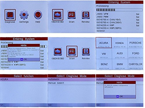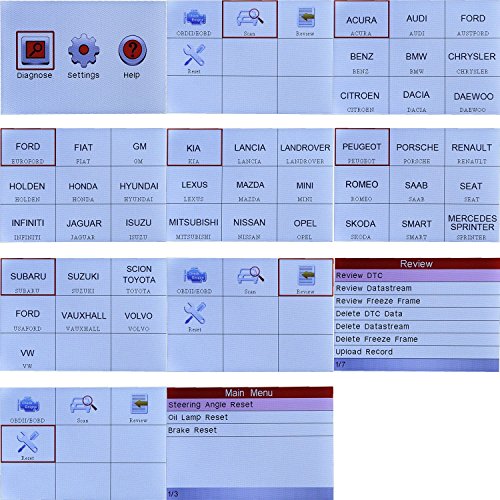 -. Feature : OBD full diagnostic functions. Four basic systems(ENG、TCM、ABS、SRS) / Multiple models (covers ten main stream models in Asia, America, etc.) / Basic diagnostic functions, including reading DTCs, clearing DTCs and reading data streams / Rubber buttons/3.5" 320*480 lattice high-definition color LCD screen/ Large-capacity memory of 1G TF Card / Supports DLC location hints/ DTC help/ Data stream display in waveform/ Historical data record and playback. Supports Buzzer alarm/ Clock and calendar/ Fast upgrading