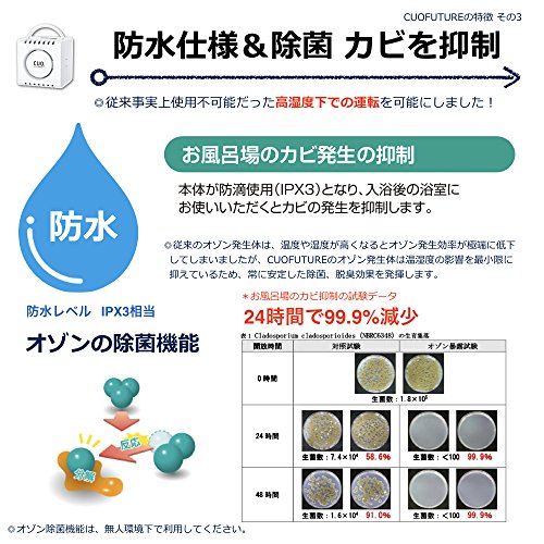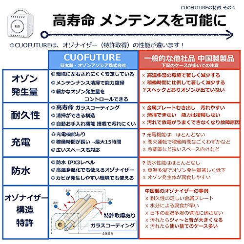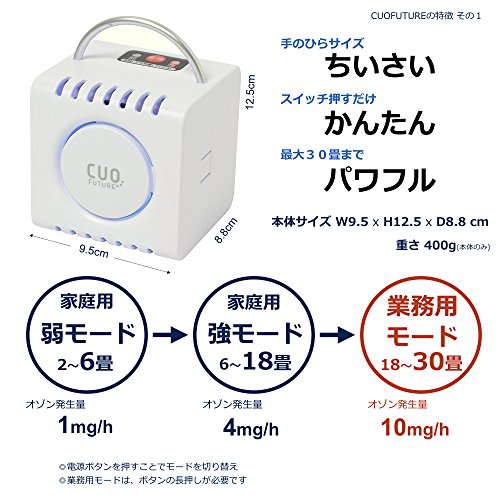 オゾン発生器 最大30畳 空気清浄機 CUOFUTURE クオフューチャー 日本製 オゾン発生器 空気清浄機 脱臭機 充電式で移動がかんたんなオゾン発生器 浴槽のカビ抑制や玄関や車のニオイの脱臭に最適な脱臭機です。 オゾンアソシア店長のおすすめポイント 充電式なのでどこにでも持ち運べます! 生活防水機能で、浴槽のカビ抑制にも活躍します ACコンセントで業務モード連続運転(オゾン発生量10mg/h) ◎ 1ヶ月の電気代 わずか30~45円程度!! ◎ 消耗フィルター交換一切なし!! ◎ オゾン発生量は、3段階切替 ◎ 業務用モード搭載 ハイパワー10mg/hで確かな脱臭力 充電式オゾン脱臭機 クオフューチャー CUO・FUTURE CUF-4 オゾン発生量 弱:1mg/h 強:4mg/h 業務用モード:10mg/h(3段階切替) 充電時間 最大8時間 充電動作時間 HI:6時間以上 弱:15時間以上 本体外径寸法:W95×H125×D88mm 本体重量:約400g(本体のみ) 推奨適用広さ:2~18畳、業務用モードの場合:30畳 生活防水レベル:IPX3 電源電圧:AC100V 50/60Hz 最大消費電力:強/2.8W 弱/2.3W(専用ACアダプタで充電動作時) 使用電池:ニッケル水素電池内蔵(容量:1000mAh) 材質:本体:AS 取っ手:アルミ 使用温度条件:0~40℃(結露のないこと) 一般的なオゾン発生器の寿命や騒音の問題を特許技術により、耐久性を大幅に向上。 メンテナンス交換部品はありません 定番在庫品 即納体制 オゾン脱臭機はニオイの成分を分解します! OCR 充電式オゾン脱臭器 オゾンエアーCUO(クオ) CU-1 CUF-4 カビ予防 防カビ剤配合 防カビ カビ 殺菌の代替品としても利用可能な脱臭機です。Feature