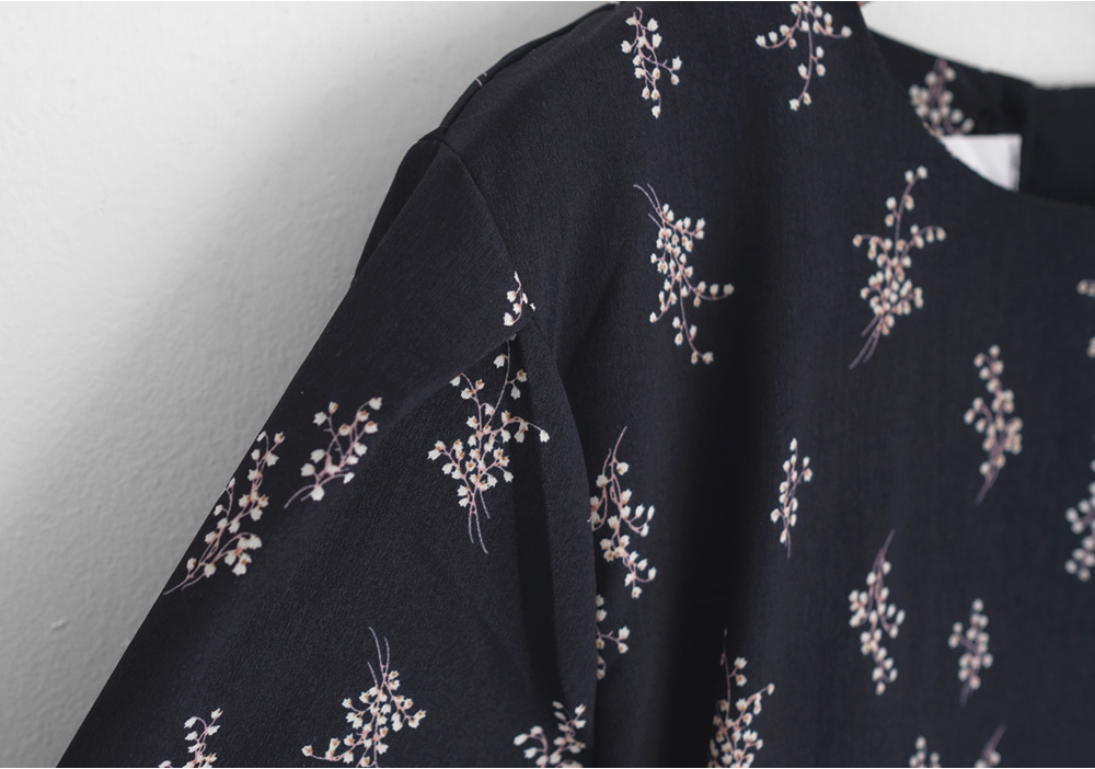 숄더와 소매에 셔링이 더해져 퍼프 슬리브로 볼륨감을 더했고요,