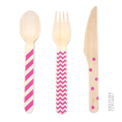 Dress My Cupcake Stamped Wooden Cutlery Set, Chevron/Striped/Polka Dot, Fuchsia, 18-Pack