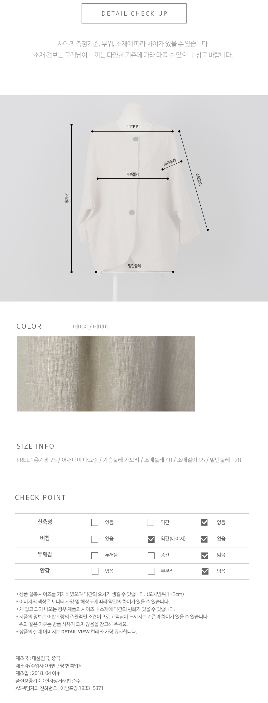 안감 없이 얇은 린넨100%의 소재감으로