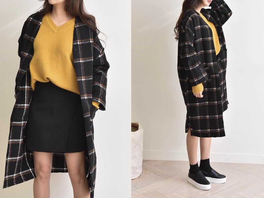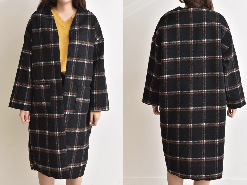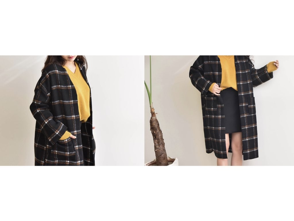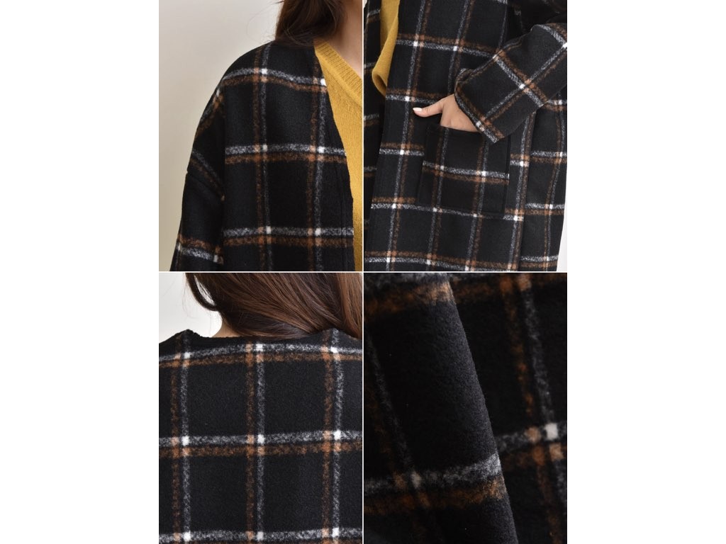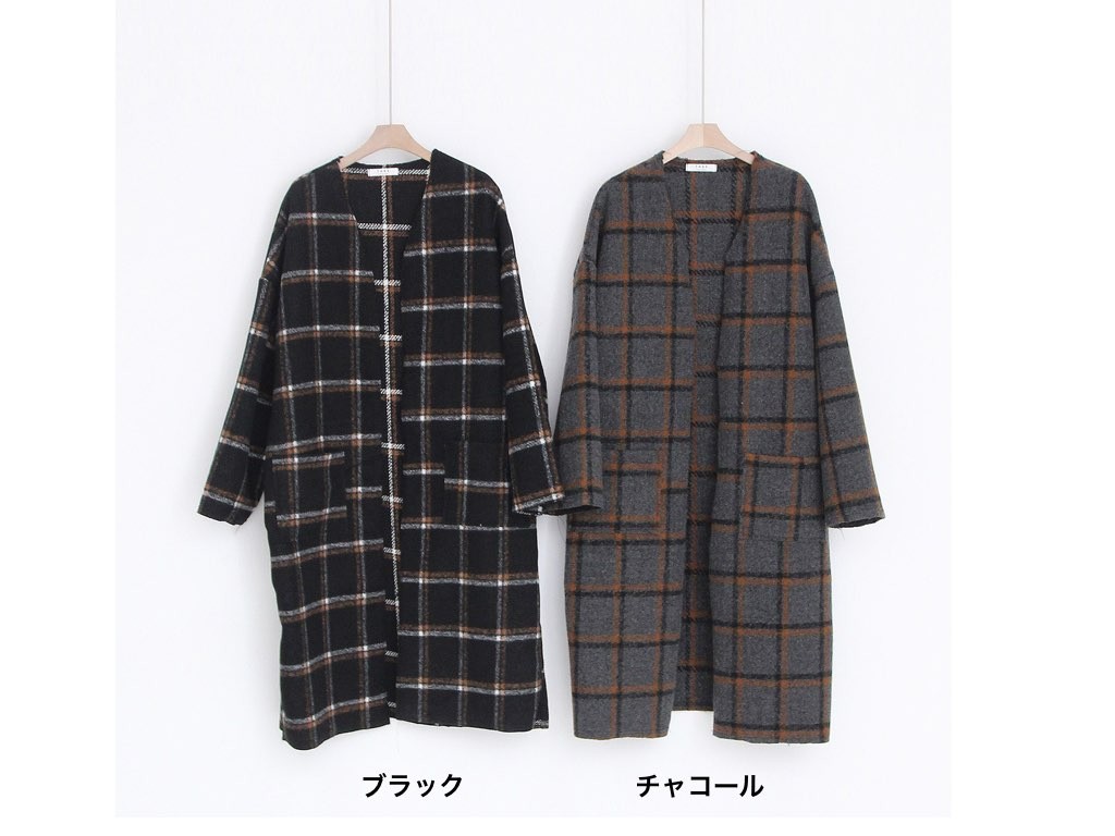 チェック柄のノーカラーコートです。さらりと着流せる長め丈です。通勤スタイル・休日スタイルなどにも最適なコートです。商品は、とても丁寧なつくりとなっています。1.基本情報色:2色展開(チャコール/ブラック)サイズ:Free素材:ウール40%、ポリエステル60%製造国:Korea2.サイズ情報肩幅:61cm身幅(胸断面):62cm 腕の長さ:44cm 着丈(前):106cm (サイズは計る方法に応じて±2〜3cmの誤差があります。ご了承お願い致します)モデル着用サイズ:F※着用モデル(163cm、体重47kg、足のサイズ24.5cm)3.その他の情報厚み:中間透け感:なし伸縮性:なし裏地:なし洗濯方法:ドライ(クリーニング)[注意事項]お取り寄せ商品は、海外より仕入れるため納品まで約10日前後いただきます。また店舗でも販売しており、在庫切れになる場合もございます。ご了承お願い致します。